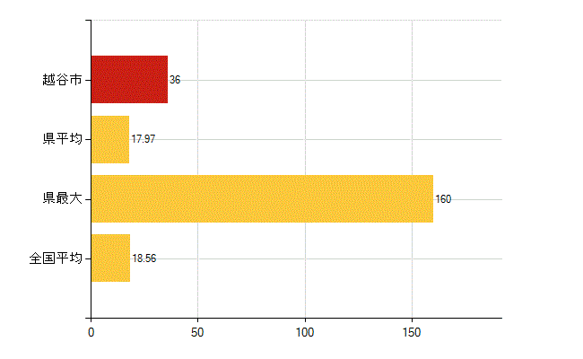 越谷市の介護老人福祉施設数は7所、児童福祉施設数(助産施設・児童遊園を除く)は36所、 保育所入所待機児童数は32人、保育所在所児数は35名、国民健康保険被保険者数は3340人です。