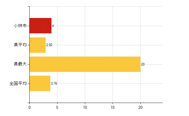 小林市の介護老人福祉施設数は4所、児童福祉施設数(助産施設・児童遊園を除く)は25所、 保育所入所待機児童数は22人、保育所在所児数は0名、国民健康保険被保険者数は1587人です。