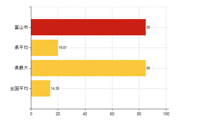 富山市の介護老人福祉施設数は22所、児童福祉施設数(助産施設・児童遊園を除く)は106所、 保育所入所待機児童数は85人、保育所在所児数は0名、国民健康保険被保険者数は10554人です。